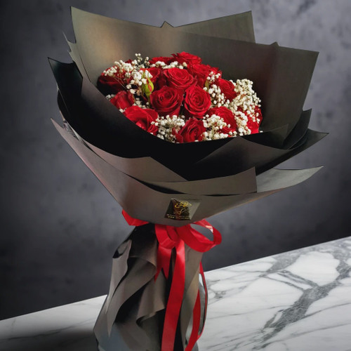 دسته گل رز قرمز لاکچری ۱۲ شاخه با تزئین ژپسوفیلا و کاور مشکی - تحویل اکسپرس در ارومیه دسته گل رز قرمز ۱۲ شاخه | تحویل فوری در ارومیه | گل فروشی آنلاین [فلوریست ارومیا]