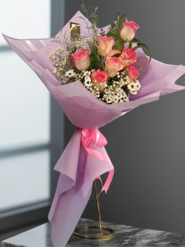 دسته گل رز لوکس صورتی ۷ شاخه با کرتنزیا | ارسال فوری در ارومیه | فلوریست ارومیا